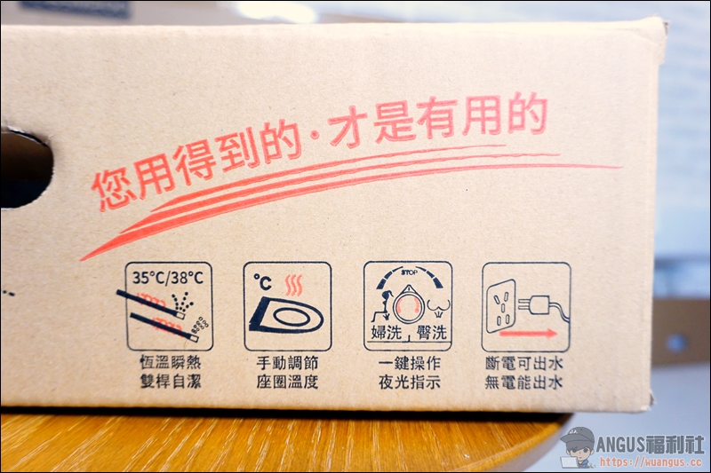 ▼ 側邊也有簡單的提到這款產品的四大特點,分別為:恆溫瞬熱雙桿自潔、手動調節座圈溫度、一鍵操作夜光指示、有無通電皆能出水。