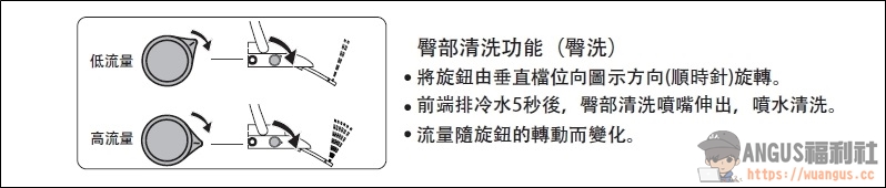 ▼ 在使用『臀洗』時,只要將旋鈕向前旋轉即可,水量隨旋鈕的轉動而變化,角度越大則出水量就越強,相對的清潔噴嘴也會自動伸出,可以看到清洗噴嘴伸出為左邊水量較集中。