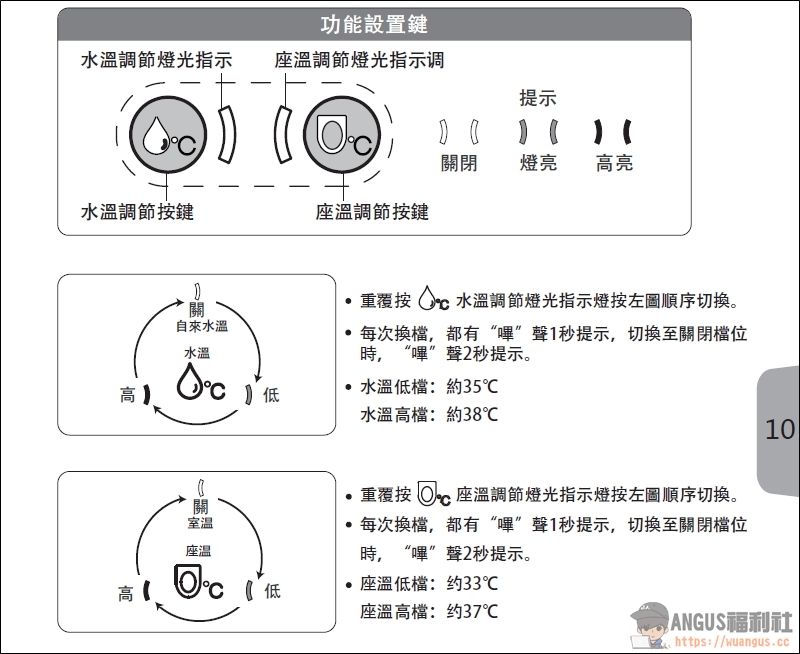- 水溫三段調節為 : 關閉無加溫、亮燈水溫約35度、高亮燈水溫約38度。
