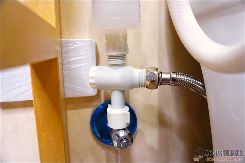 ▼ 進水軟管一頭安裝在 KW-206 電腦馬桶座,另一頭則安裝在三通接頭,而進水軟管兩頭的設計有些許不同,有一頭為 L 型設計,如果家中的馬桶不符合安裝 L 型那一頭,也可以顛倒安裝另一頭方向,就不會被卡住了。