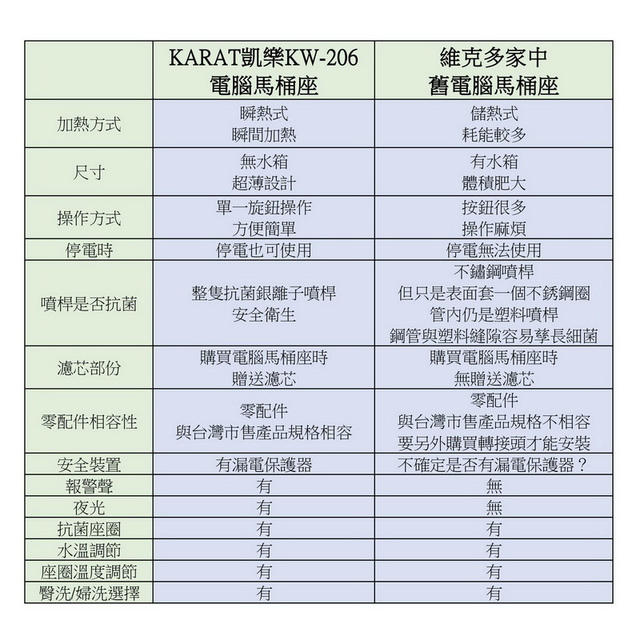 最後我簡單的替KARAT凱樂衛浴KW-206超薄型瞬熱式電腦馬桶座與家中舊的電腦馬桶座做了個優缺點比較。