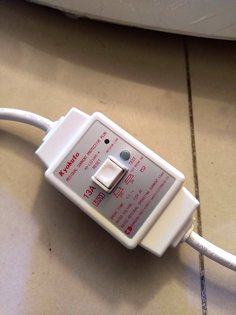 這裡有一個很重要的安全設計,就是漏電保護器,也就是上圖電線中那個方形的東西,他的原理很簡單,當流出電流不等於輸入電流時,他就會跳脫。我們浴室水氣多,也不是每間浴室都有乾溼分離設計,更可怕的是我們的屁屁坐在馬桶座上,萬一不幸發生漏電問題,很容易發生危險,所以需要漏電保護器的保護。這裡我再替漏電保護器來張特寫。