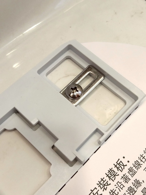 接下來我覺得這是一個很重要的步驟。就是使用安裝模板定位,這會影響之後安裝電腦馬桶座的前後左右平衡,將定位模板與原來的馬桶左右標齊前後對正,這樣電腦馬桶座安裝之後就會跟原來的馬桶切齊了。