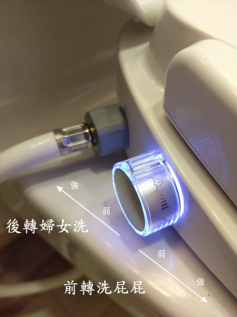 - 面對電腦馬桶座的左側邊,是一個無段式的夜光旋鈕,如果你坐在馬桶上將旋鈕往前推,噴桿自體清潔 5秒後,臀部清洗噴桿伸出噴水清洗你的屁屁,之前說過這是無段式的旋鈕,水量大小會隨著旋鈕的轉動而變化。如果你把旋鈕往後推,這時候是婦女清洗專用,簡單來說就是男女身體構造的不同,所以需要不同角度的清洗方式。