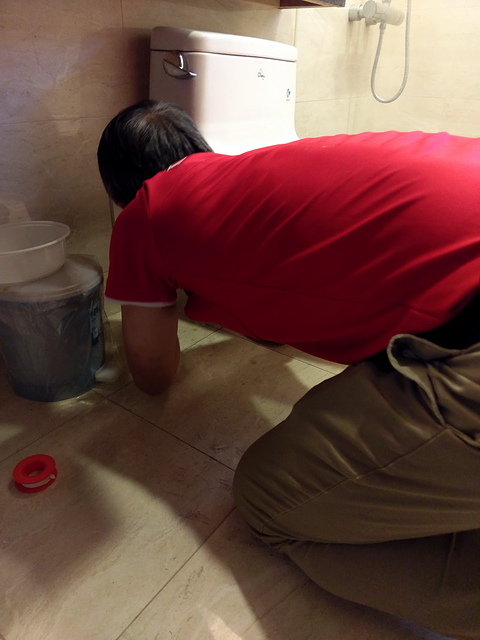 師傅整個跪在地板上,開始安裝三通接頭,濾芯與進水軟管,因為空間有點窄,師傅整個人跪了好一陣子才安裝好,對師傅有點不好意思啊。