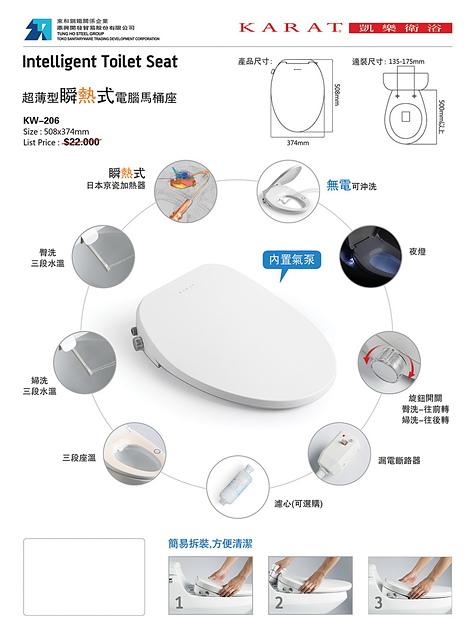 選了半天,最後我決定安裝KARAT凱樂衛浴的KW-206超薄型瞬熱式電腦馬桶座。KARAT凱樂衛浴是為美國KOHLER集團生產、製造、銷售之主力品牌之一,而美國KOHLER集團從1873年在美國威斯康辛州成立至今已有145年的歷史,是美國最大的衛浴設備的製造公司,也是全球最爲消費者熟悉高端的衛浴生產集團。美國KOHLER集團目前在世界各地擁有四十五家工廠,主要生産臉盆、馬桶、龍頭、浴缸等衛浴産品。