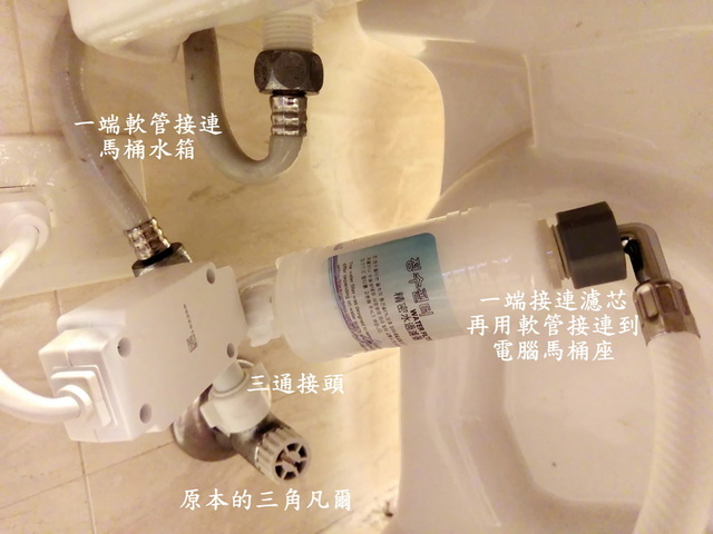 師傅完工後我也跪下去看了一下馬桶底下的走線,在原來進水的三角凡爾上新安裝一個三通接頭,一端用原來軟管連接馬桶水箱,另一端先連接濾心,再用新的軟管連接到電腦馬通座。