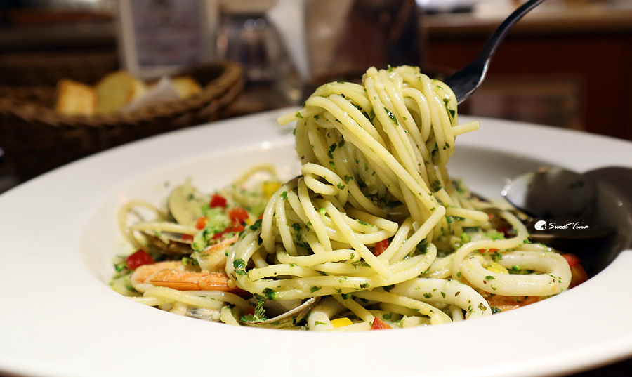 羅勤海鮮總匯義大利麵 - 有蝦子、透抽、蛤蜊、甜椒、菇類,而羅勤略帶點片狀,所以吃起來香氣十足,麵條料理的清爽可口,是我喜歡的口感。
