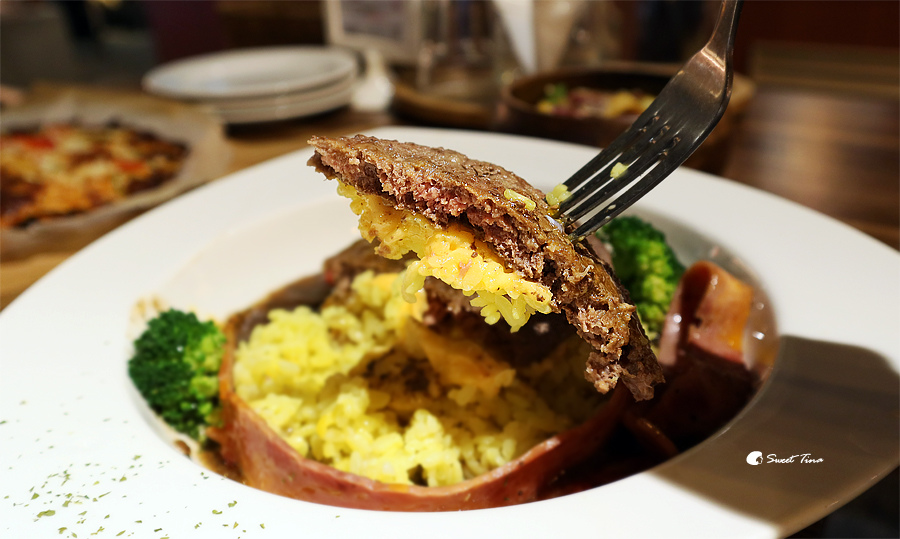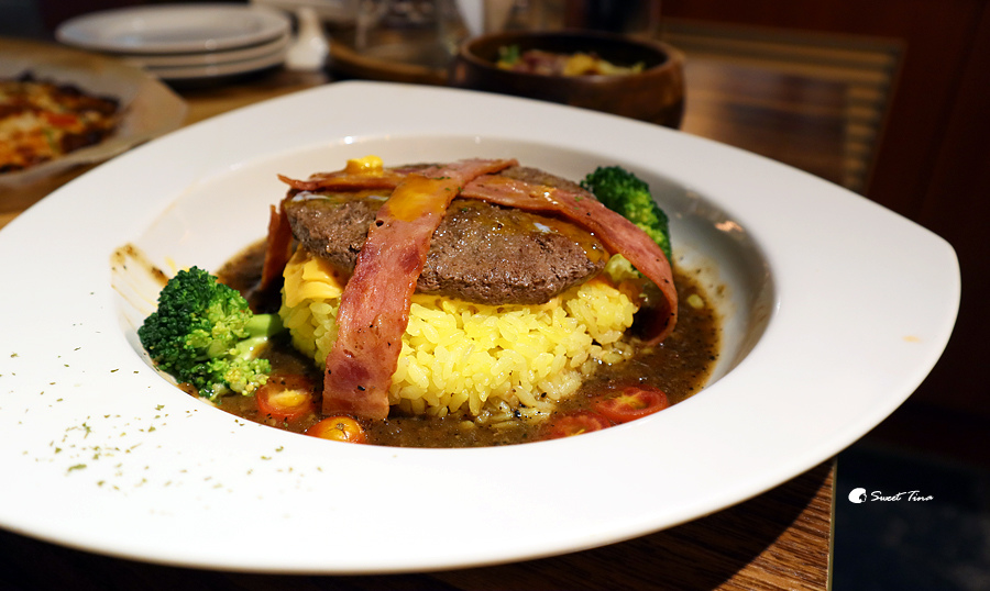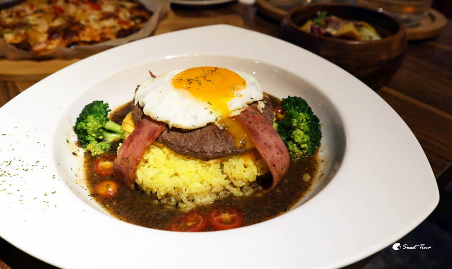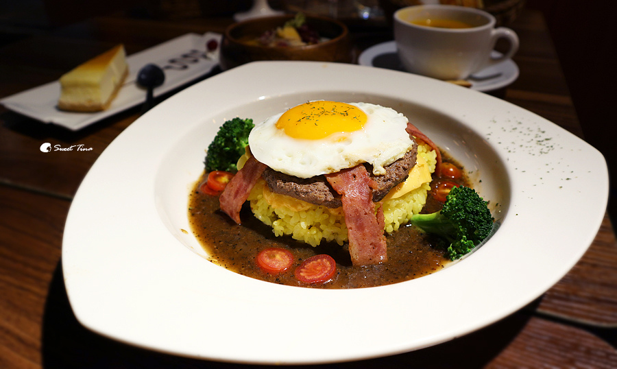 黑胡椒漢堡排起司飯 (辣) $380- 這道餐不僅層層堆疊,色彩也很鮮明,光看就讓人食指大動,搭配了太陽蛋、漢堡排、起司、火腿,而漢堡排的牛肉是澳洲牛肉。
