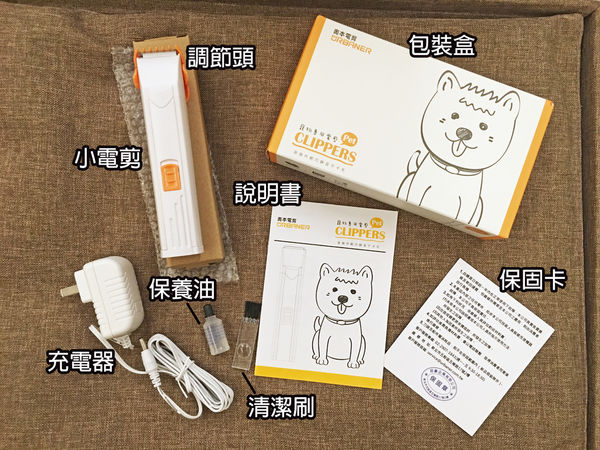 打開看看內容物有哪些吧!小電剪本體、調節頭、充電器、保養刷和油、說明書、保固卡通通都有
