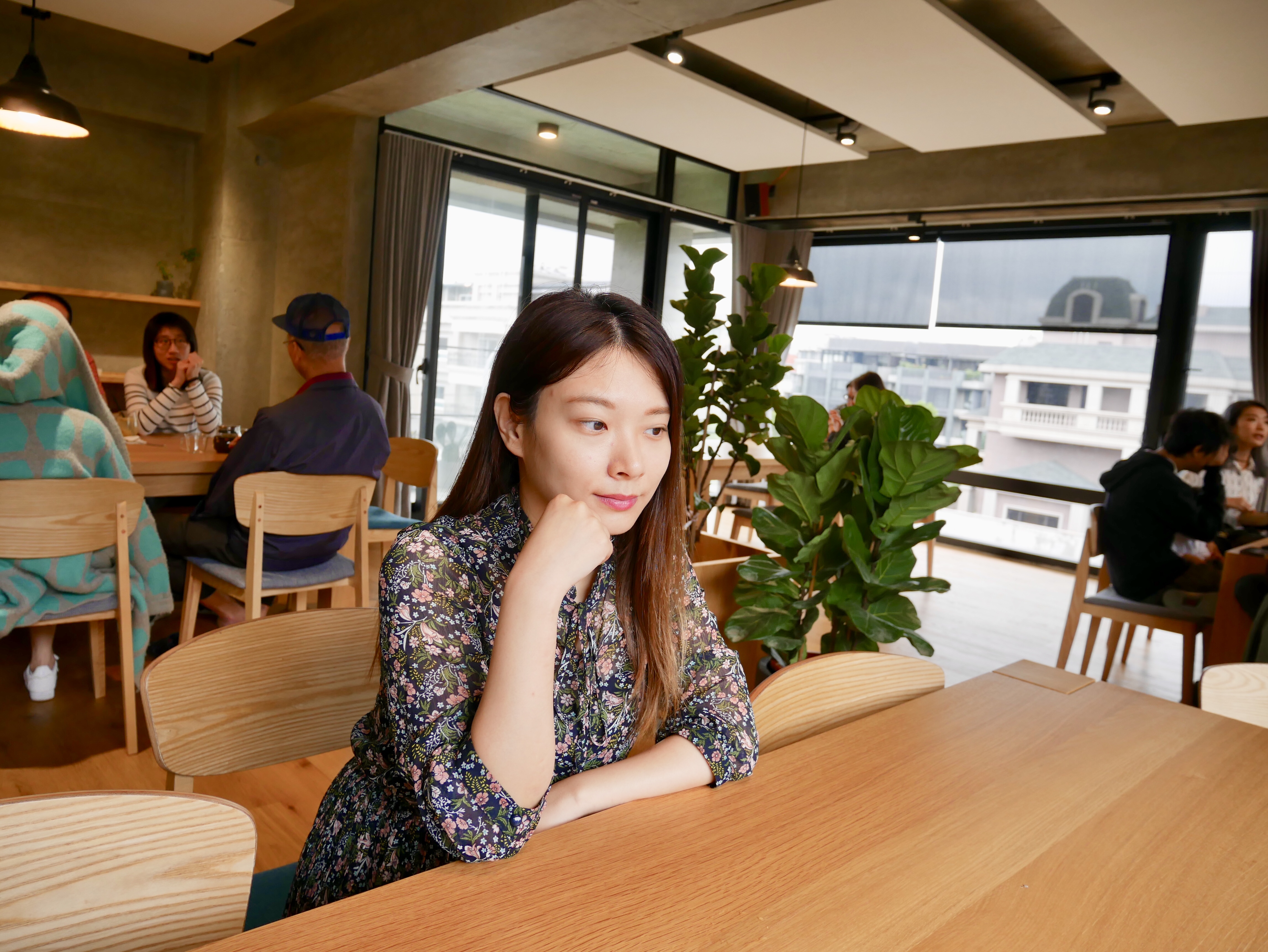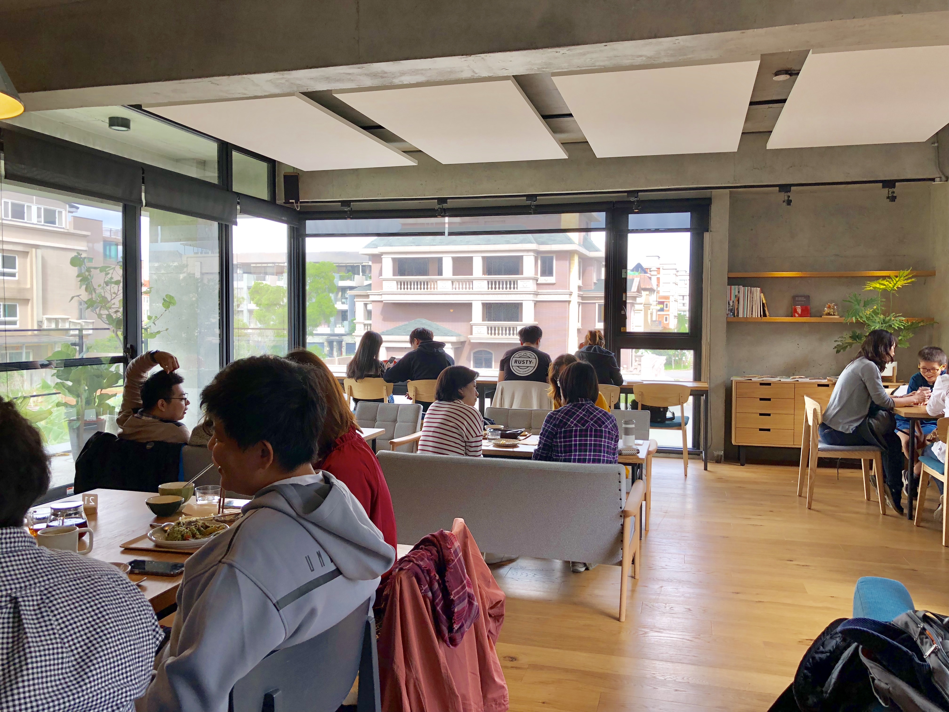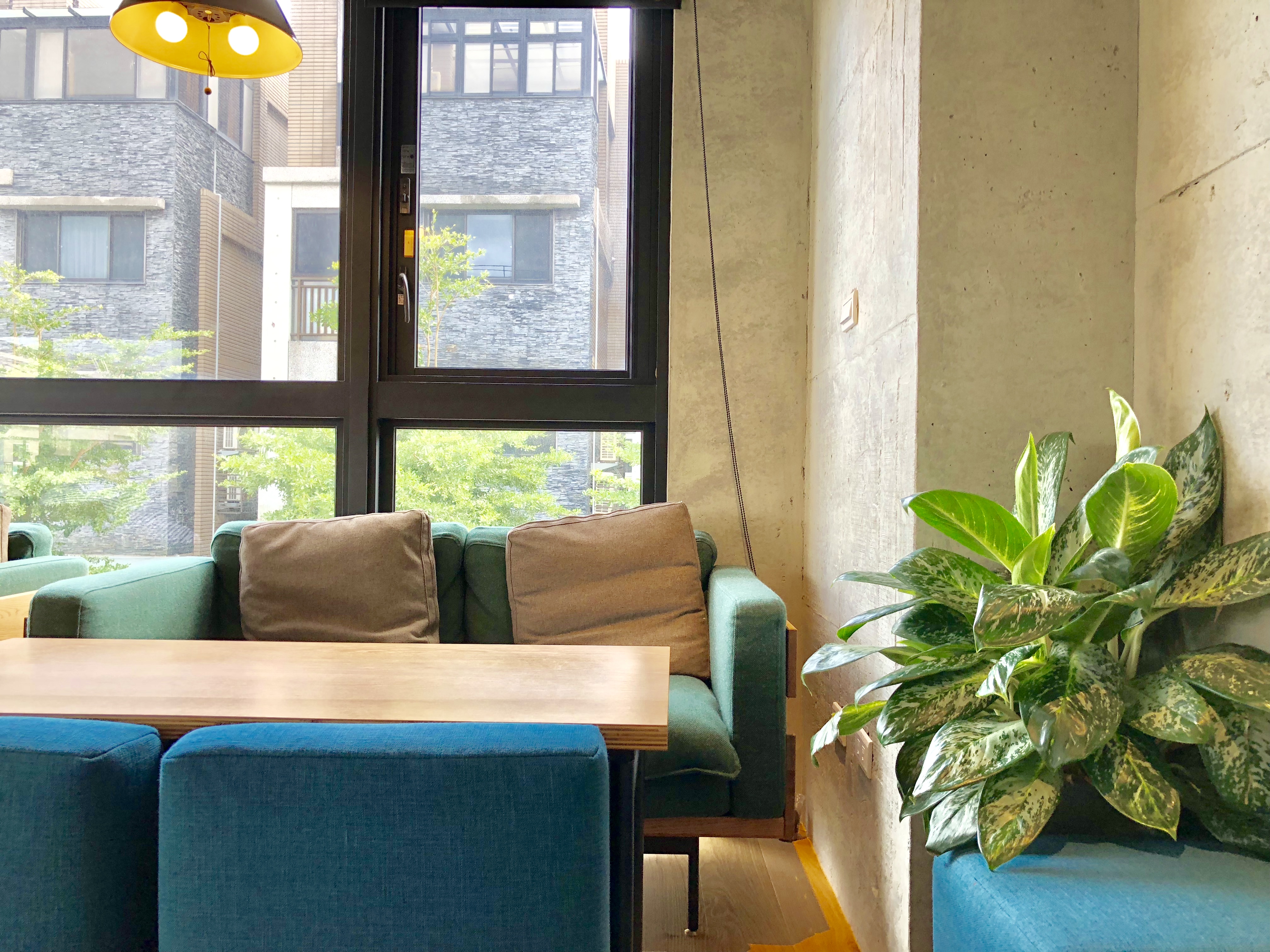 一樓明亮的陽光照射採光很好 , 搭配白色氛圍及湛藍色沙發 , 穿插的木質圓桌 , 窗邊的座位 , 是讓人可以在這放空整天的空間