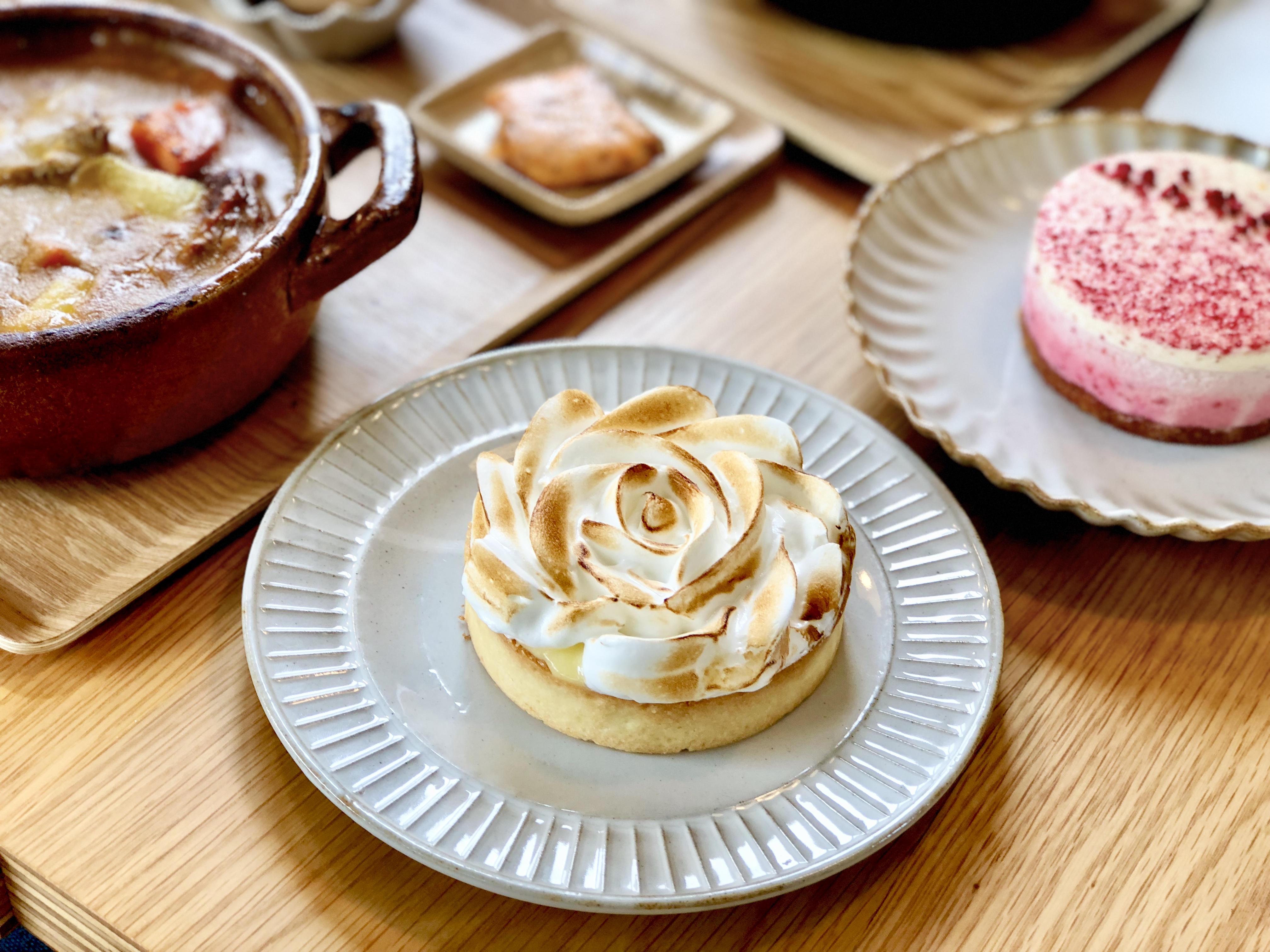 花型蛋白霜微甜 , 檸檬塔酸但會回甘 , 一甜一酸的衝突 , 倒很適合當飯後的甜點