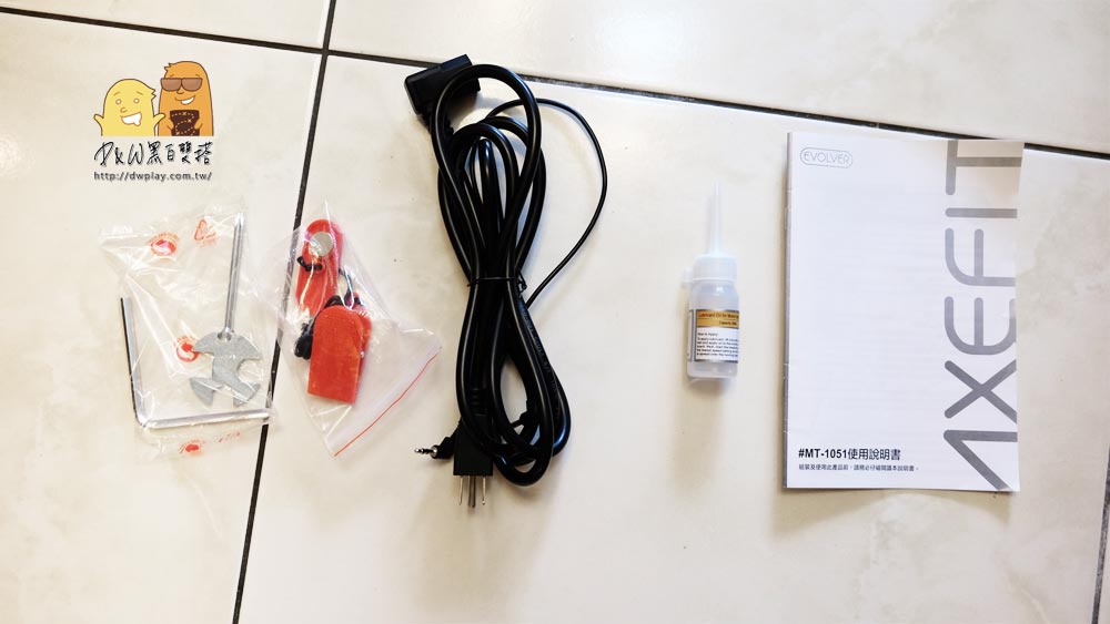 說明書、機器潤滑油、電線、開機磁釦、完全用不到的工具(因為都裝好啦)