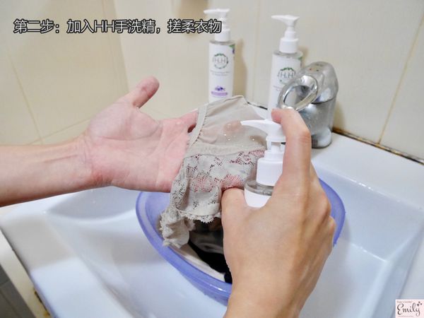 第二步:加入HH女性私密衣物抗菌手洗精,並溫柔的搓洗衣物
