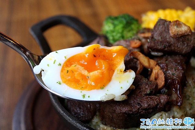 俯拍來一張,燉飯上方擺了滿滿大塊的骰子牛肉、花椰菜、玉米和糖心蛋。