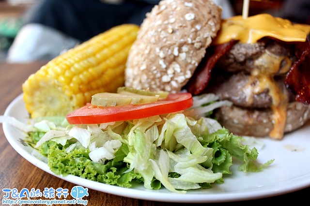 因為漢堡麵包上已經擺了兩大塊的肉、起司和培根,