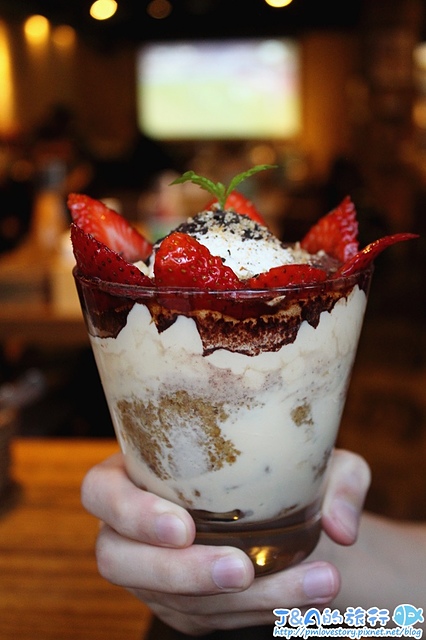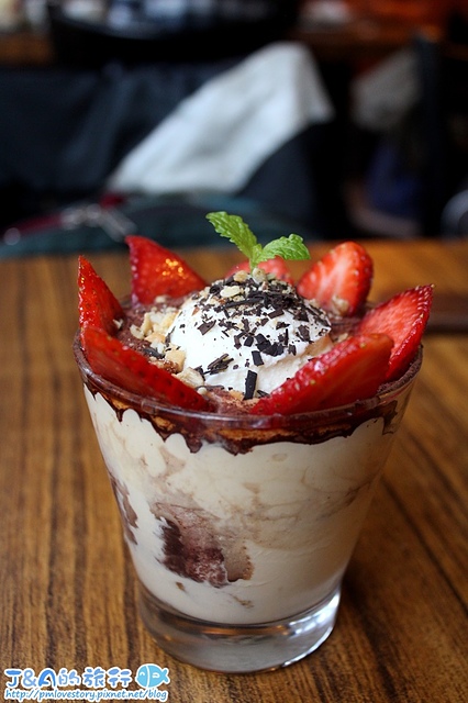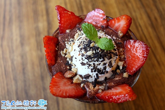 甜點上方灑上了堅果、可可粉和碎巧克力,在杯緣以草莓片做裝飾,