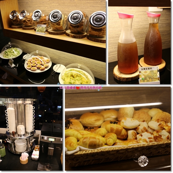 有吐司、可頌、餅乾、新鮮水果 、咖啡等~還有用宜蘭名產金棗泡的金棗茶