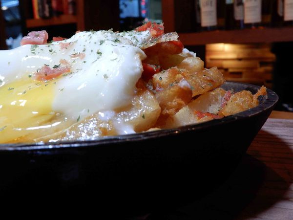 帕馬火腿在理頭是增加香氣用的 ,薯條炸的真的非常酥脆 ,跟著半熟蛋搗碎後半熟蛋有點濕潤