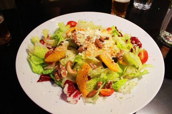 除了綜合生菜與起司外,還有培根、烤南瓜片及核果,口感豐富。