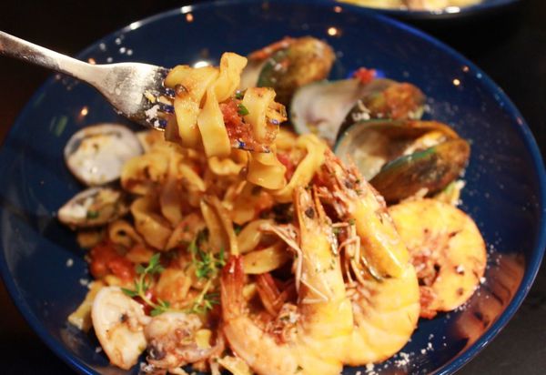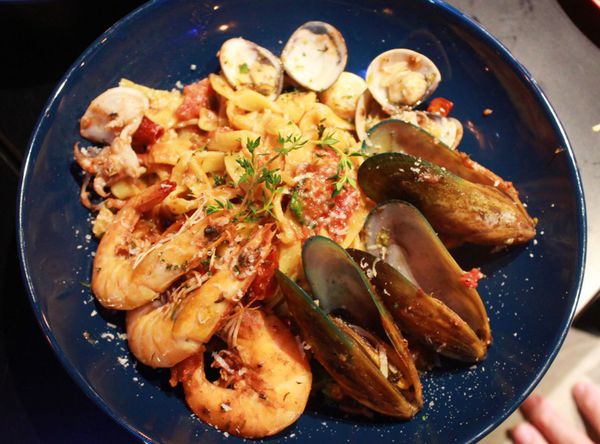 不過上桌的義大利麵上面圍上一整圈的海鮮,有大蝦、蛤蜊、淡菜、花枝,把本來很基本款的義大利麵身價提升許多。