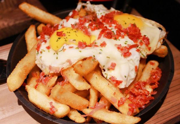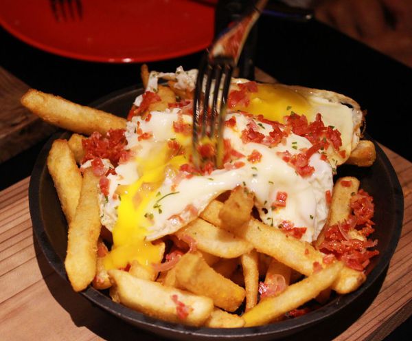 第一次看過在薯條上鋪上半熟蛋還點綴火腿的吃法。