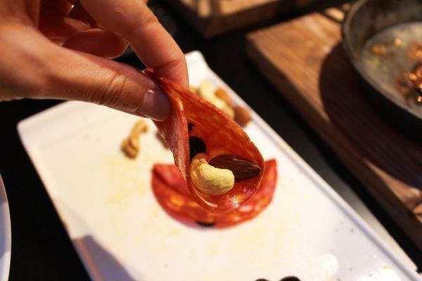 sasa把臘腸捲著隨附的堅果、橄欖一起吃,比起單吃更讚唷。