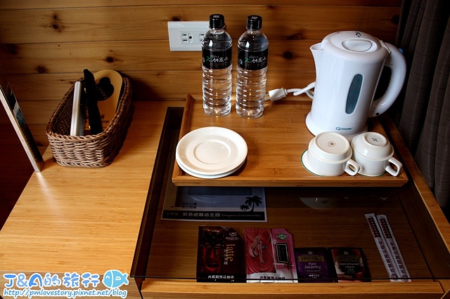 櫃子的上方則是有擺放遙控器、熱水壺、礦泉水、茶包和咖啡粉,