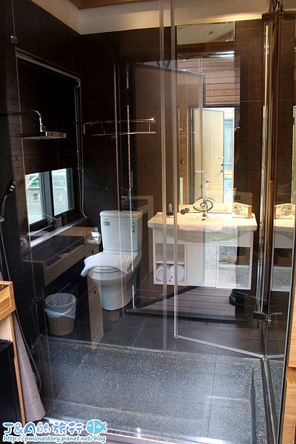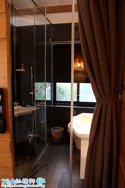 洗手間的門也是採透明玻璃設計,同樣有厚布簾可以拉起來唷!
