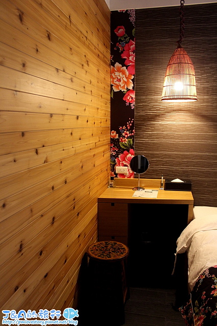 床邊還有設計化妝台,旁邊也有提供插座,如果要用電腦的話也很方便。