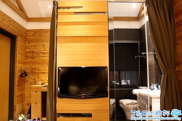 躺在床上時正前方就是電視,洗手間的門口也有布簾可以拉下,完全不會煞風景XD