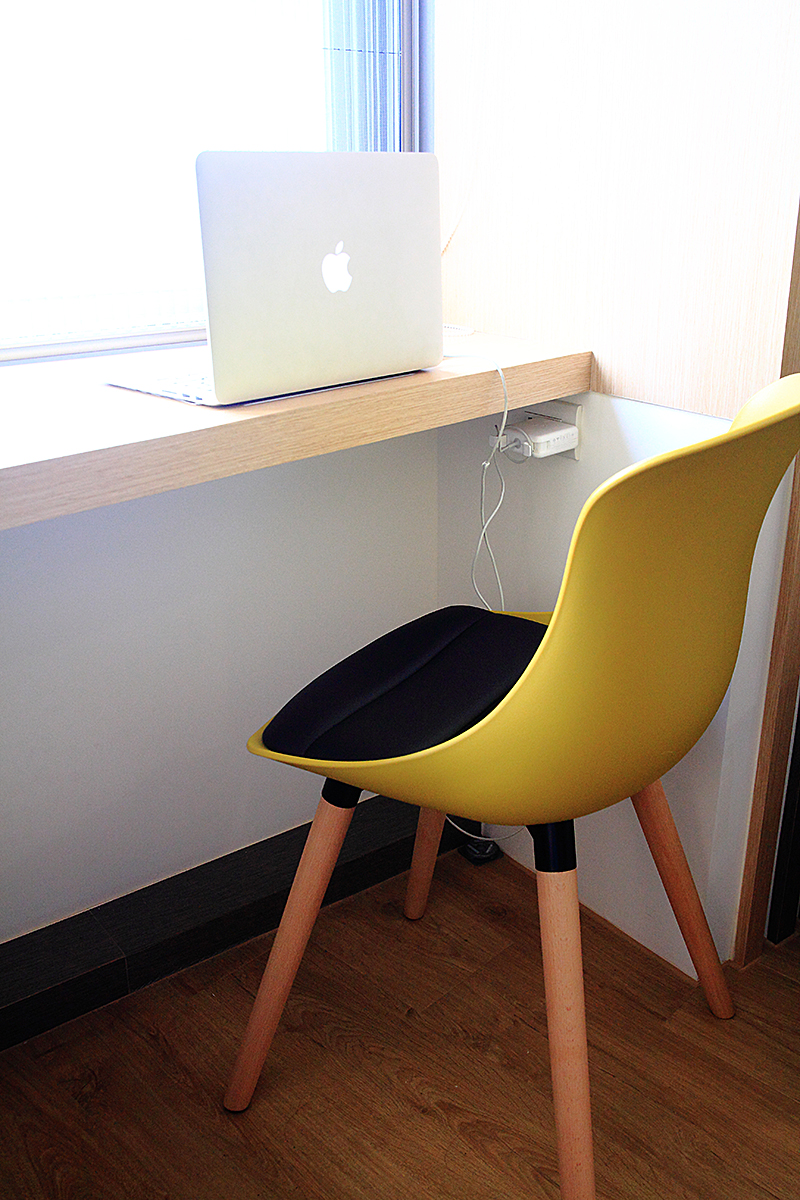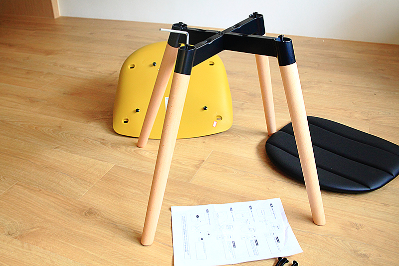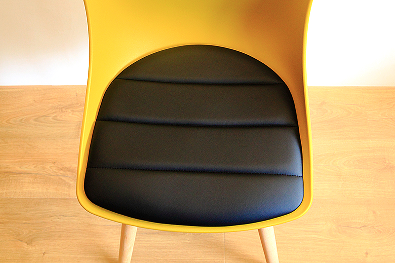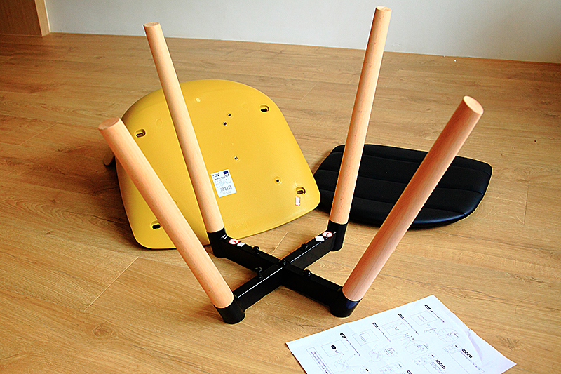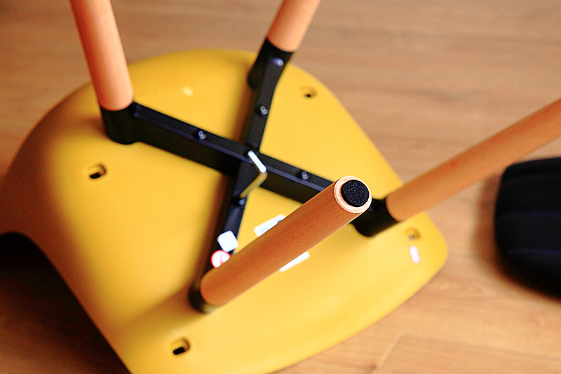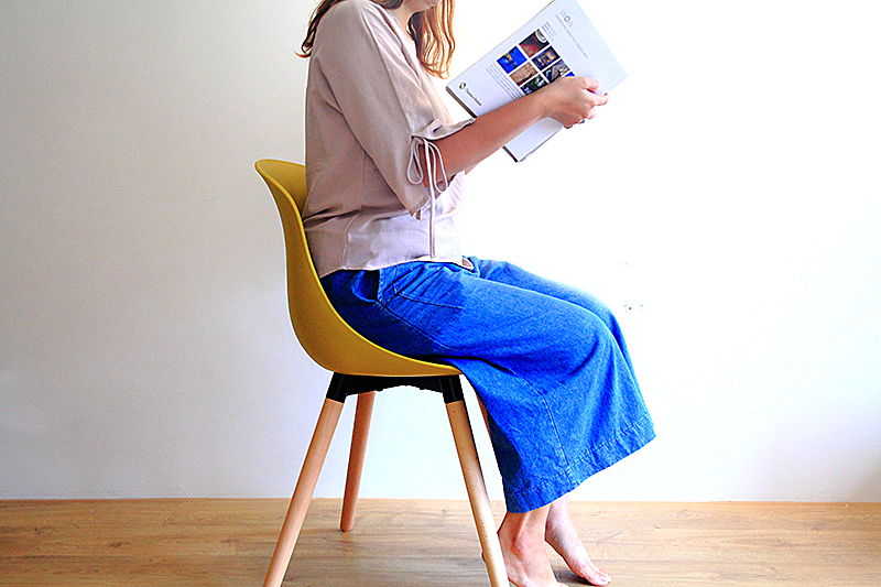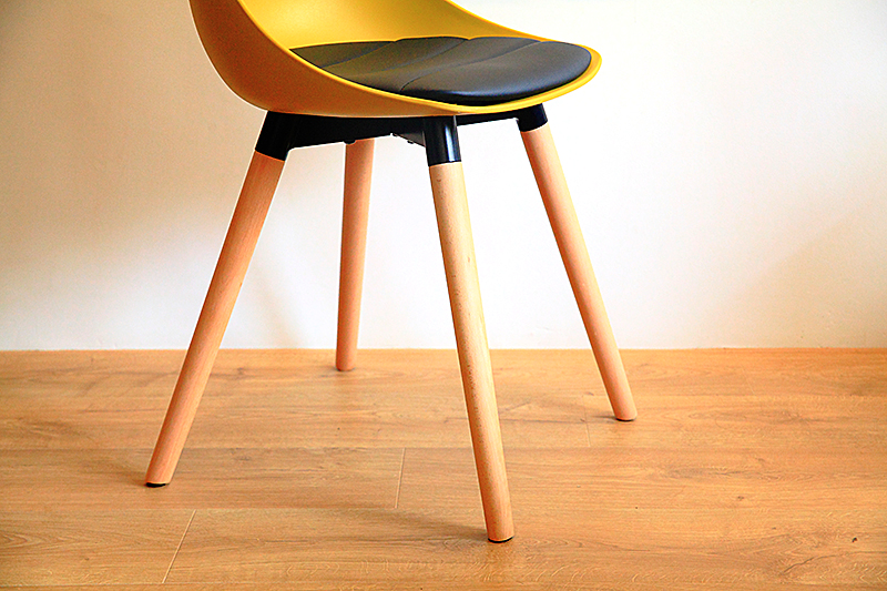 萊特塑鋼椅Wright plastic chair,固定尺寸45x43x100公分,差別在於顏色、款式不同,萍子特別挑選主體顏色-黃色+座墊材質PU皮黑色+椅腳款式-櫸木椅腳,挑選好,直接拿去櫃檯結帳,就可自行搬回家,自行組裝。