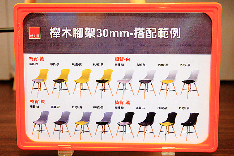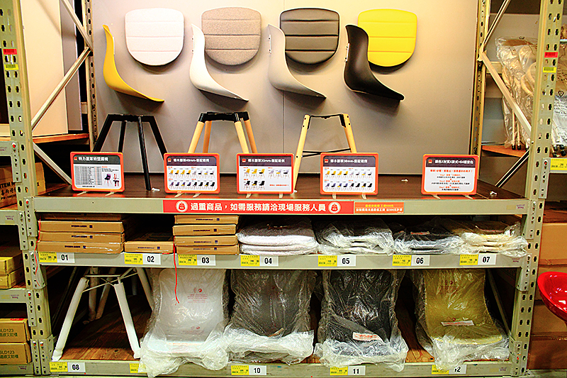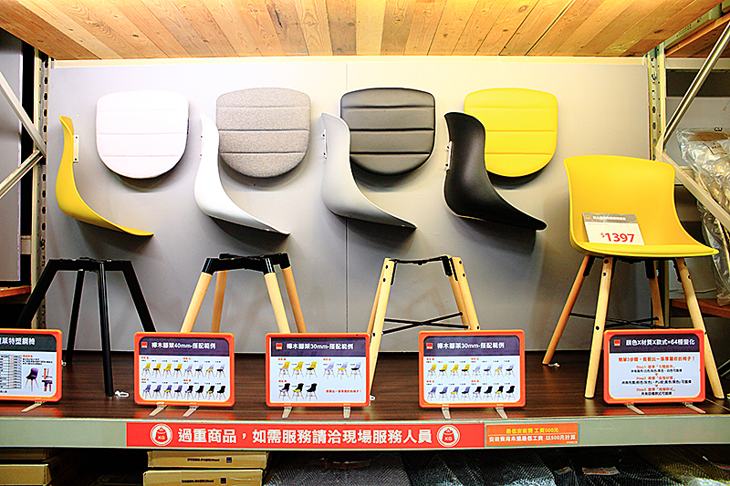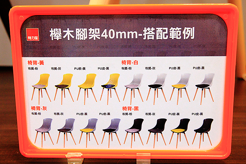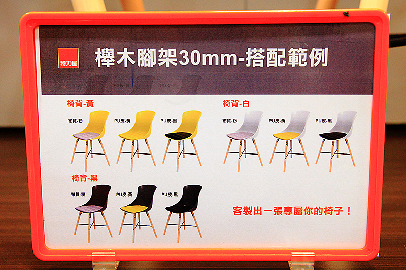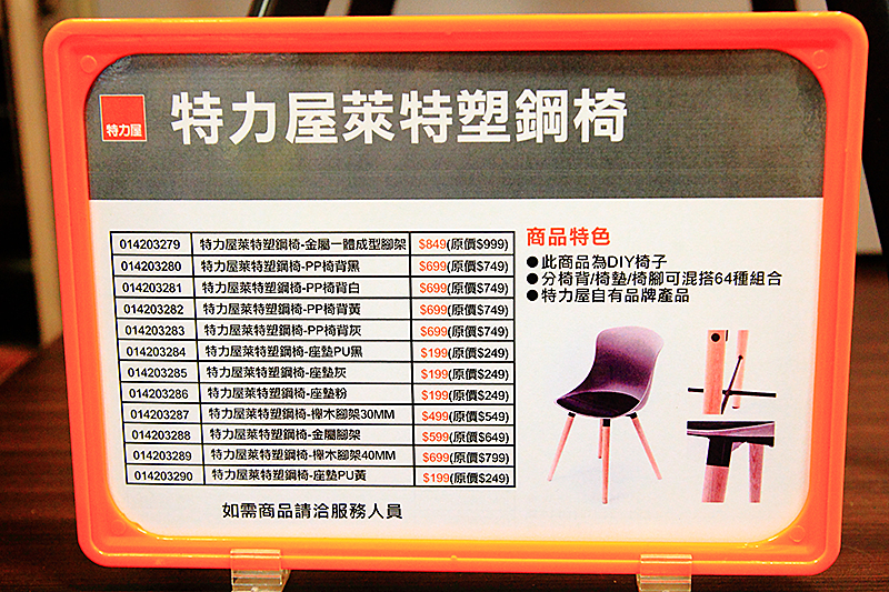 現場提供一個特力屋自有品牌 萊特塑鋼椅Wright plastic chair 展示櫃,陳列這系列所有商品,這系列椅子原來定位是DIY自行組裝系列,方便攜帶,方便購買帶回家組裝。