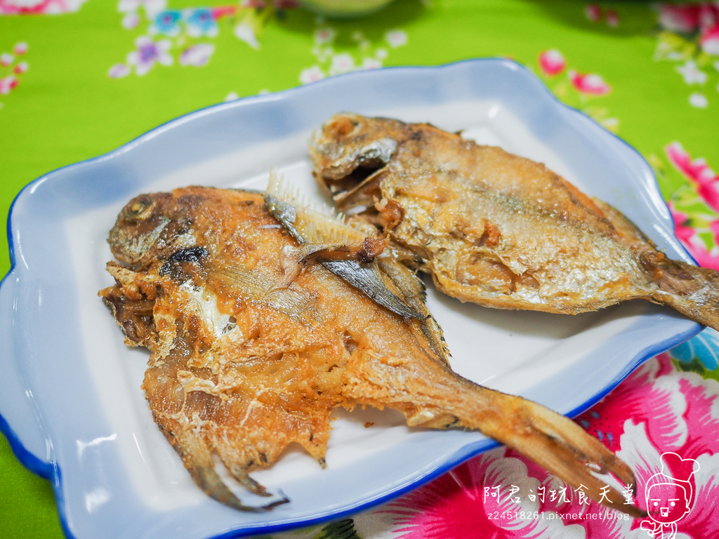煎白鯧,近年來白鯧真的不便宜,白鯧這麼受歡迎的原因,我想應該是因為魚刺少吧,吃起來很方便(笑),除此之外,肉質也很細緻喔,這個魚皮很薄,一翻面很容易掉光光,所以要煎的時候該會拍一點麵粉,這樣金黃酥脆的外皮就有啦,真的很有阿嬤的味道。