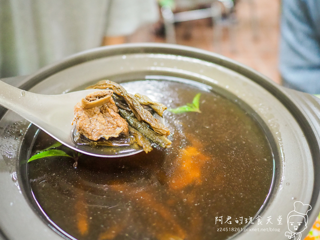 客家豆仔乾湯,客家代表的醃菜之一,豆仔乾,呈現咖啡色澤,煮好的湯也會是咖啡色的,湯頭喝起來很清爽甘甜,不過缺點是,這鍋料真的太多,整個吃不完。