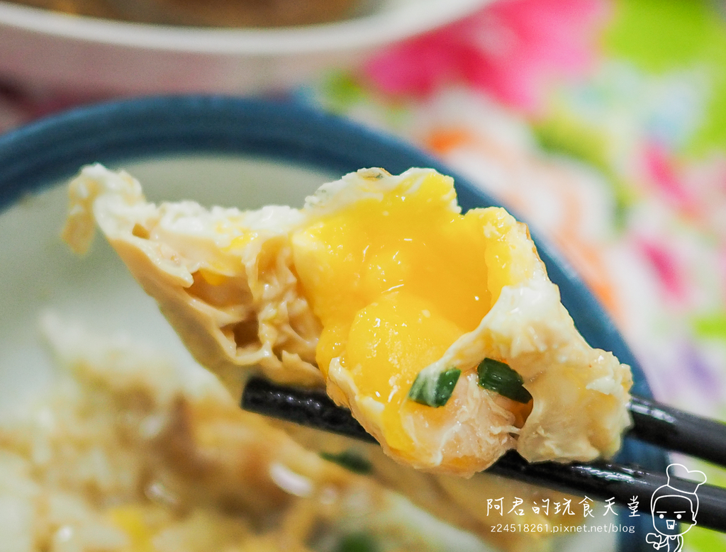 阿婆的水蛋,這個蛋好特別,是用煎的半熟蛋,接著泡在醬汁裡頭,切一塊放在飯上面之後,戳破它,加點醬汁,配飯吃一整個美味。