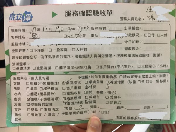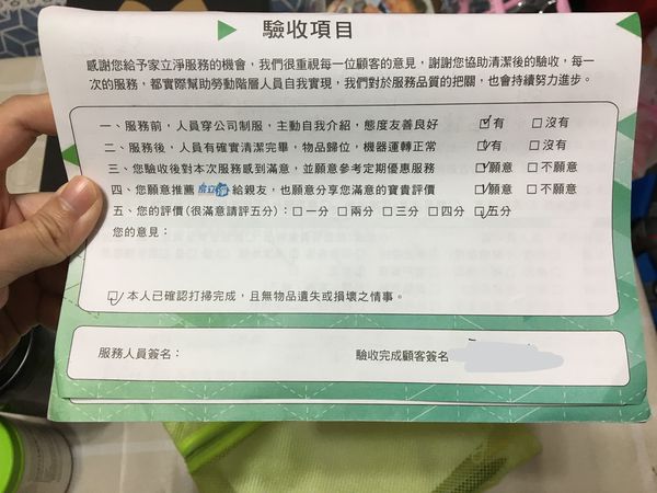 整個清潔完畢後會有一個驗收單,簽名確認完成後就結束今日的清潔工作