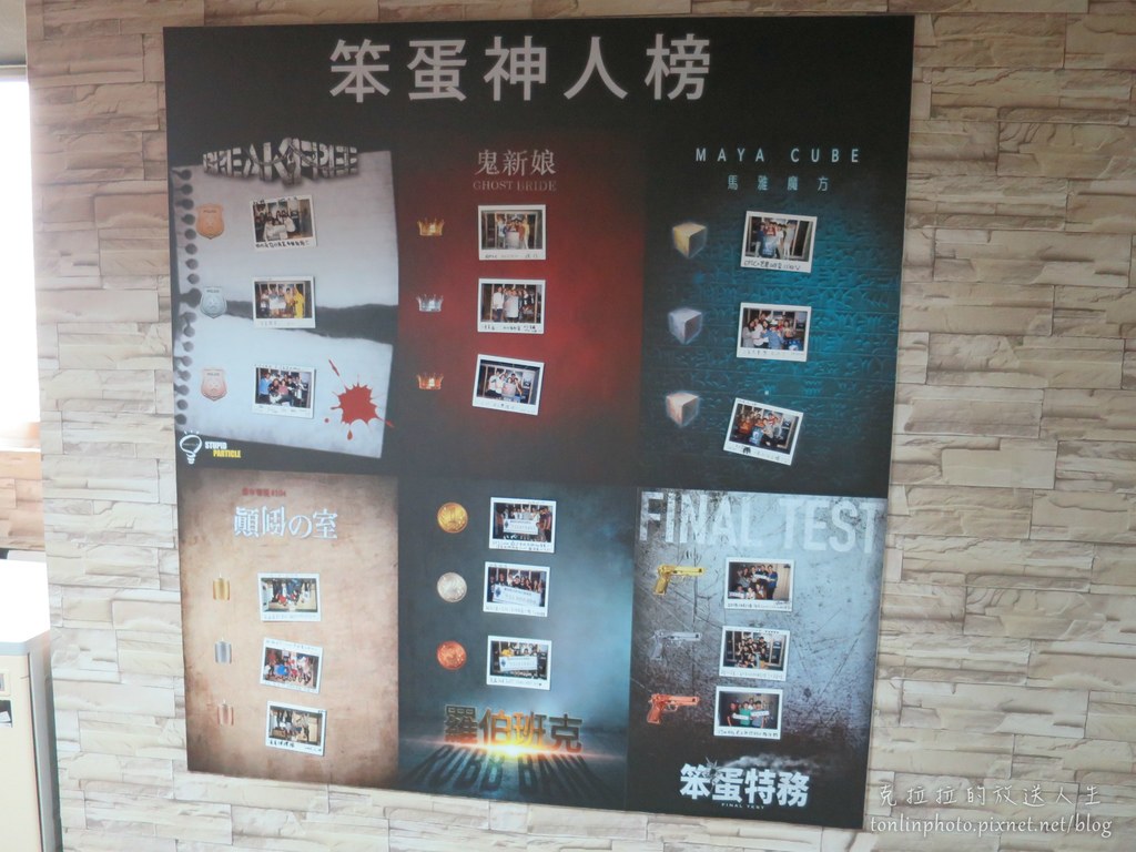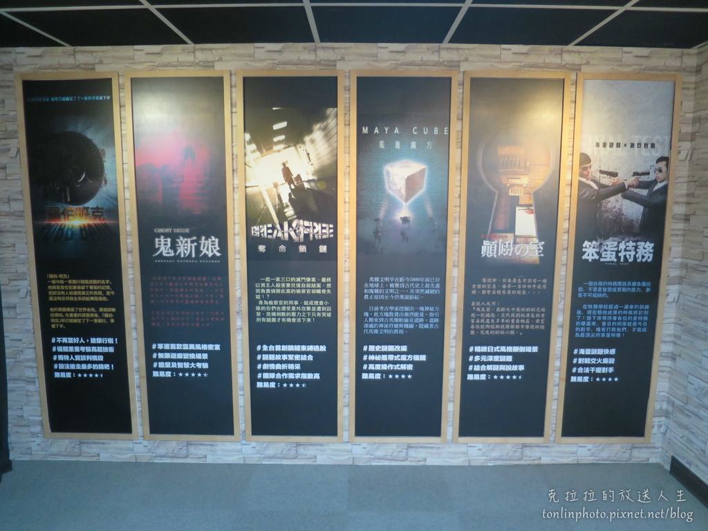 進到笨蛋工作室,左邊牆上六款叫好又叫座的密室逃脫實境遊戲的視覺與說明,也有難度的星級標示。分別是笨蛋特務、顛倒之室、馬雅魔方、奪命鎖鏈、鬼新娘、羅伯班克,看來我們選到了難度四星半的一款遊戲啊!