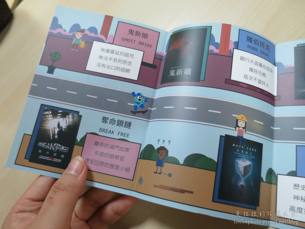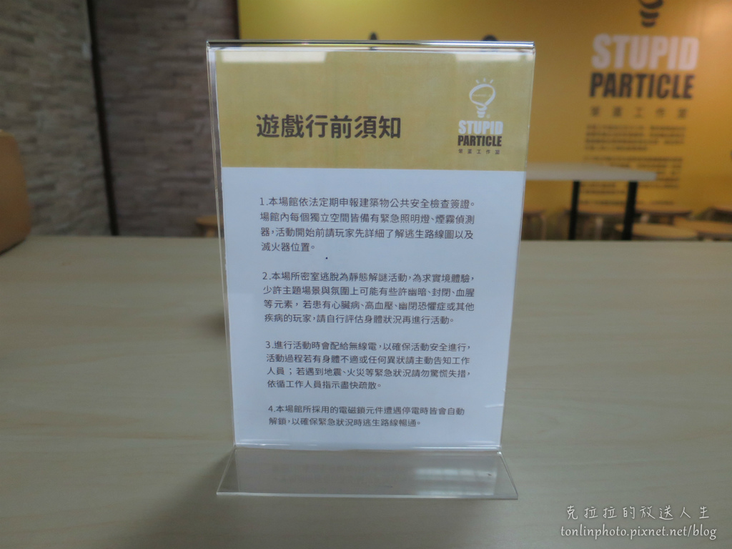 我們在寬敞的等待區等朋友集合,這裡還有可愛的背板也可以拍照留念。桌上有些遊戲的注意事項,大家也可以事先閱讀喔!基本上因為密室逃脫遊戲都是靜態的解謎遊戲,但是因為場地和遊戲設計上有些破關上的巧思,若有相關疾病(如心臟病、高血壓、幽閉恐懼症)或懷孕不建議參加喔!國小以下的小朋友若要一同參加,報名的時候需先告知工作人員,且全程需家長陪同,並隨時注意孩童安全。(可以帶小朋友一起來,爸媽也可以比較放心地一起玩耍啊~)