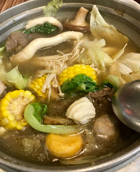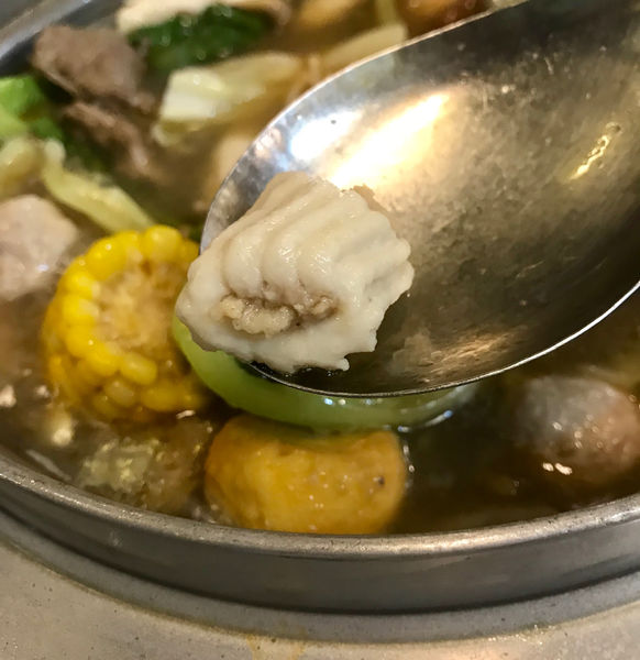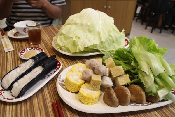 而拼盤內有玉米、凍豆腐、香菇、金針菇、秀珍菇、鴨肉小丸子、鴨肉小菲力、水晶餃、大陸妹等等