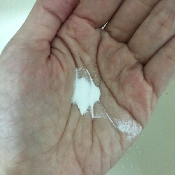 E.G.F.s+™保濕潔顏粉到在手心上,臉部先用水潑溼,潔顏粉遇水搓揉後會有些微泡沫,洗臉時滑順好洗