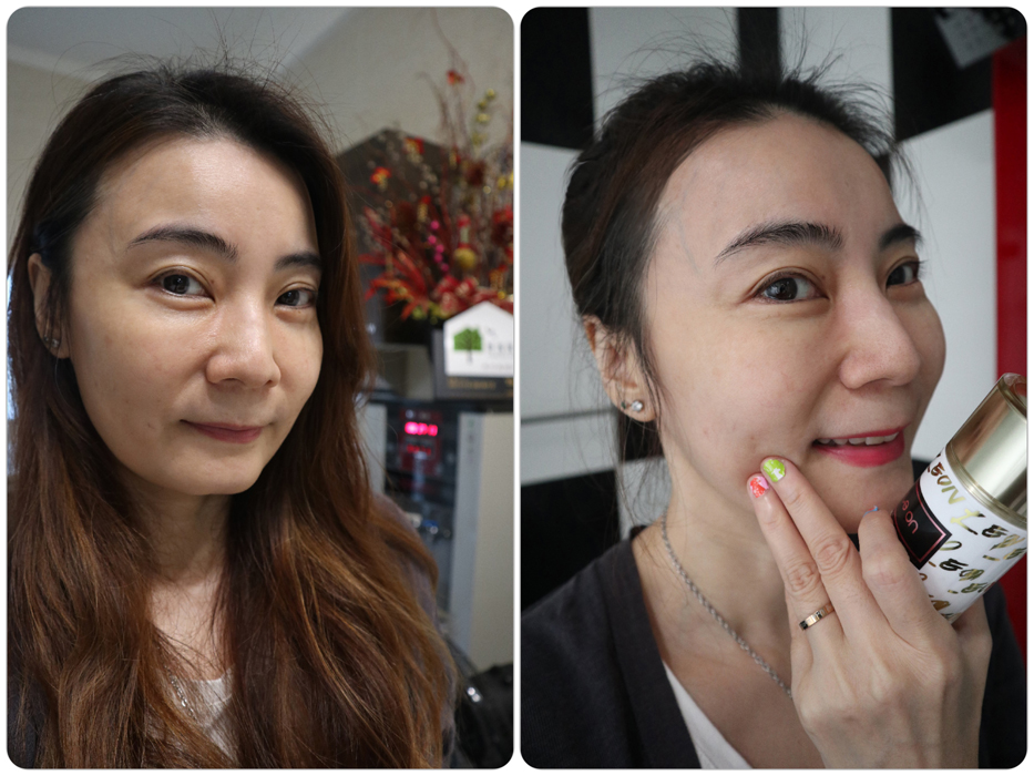 下圖右:使用E.G.F.s+™ 全效修護精華露,吸收超快,肌膚有保濕透亮的光澤感,這款修護精華比較特別的地方是越用越有感喔!