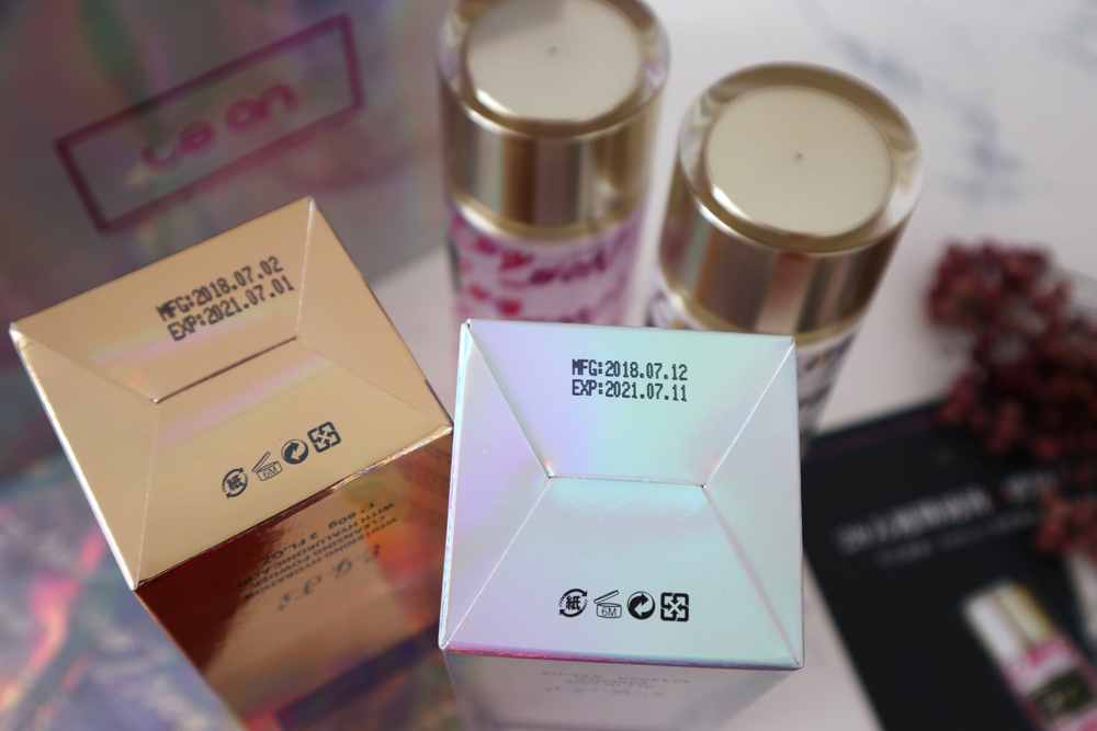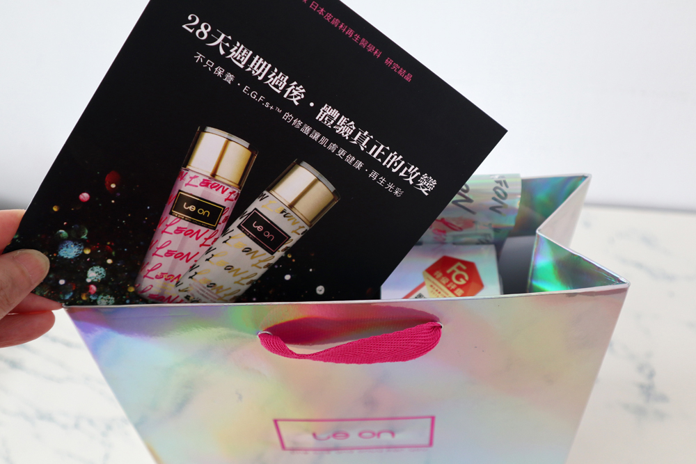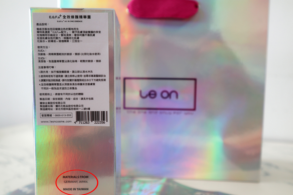 Le On麗容妝品 E.G.F.s+™全效修護套組的包裝很有時尚感,製造有效日期清楚的印在外紙盒底部。