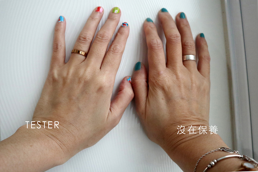 經過累年累月不保養的右手 v.s 時常做保養品測試的左手,實驗證明沒擦保養品的傷害不小,有沒有保養真的很重要!!!