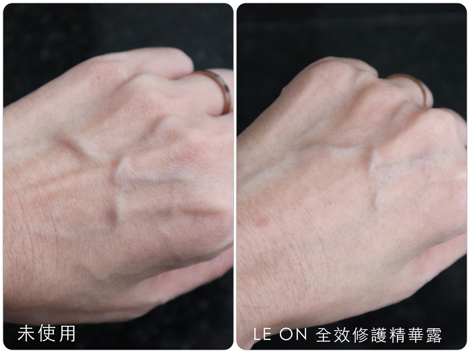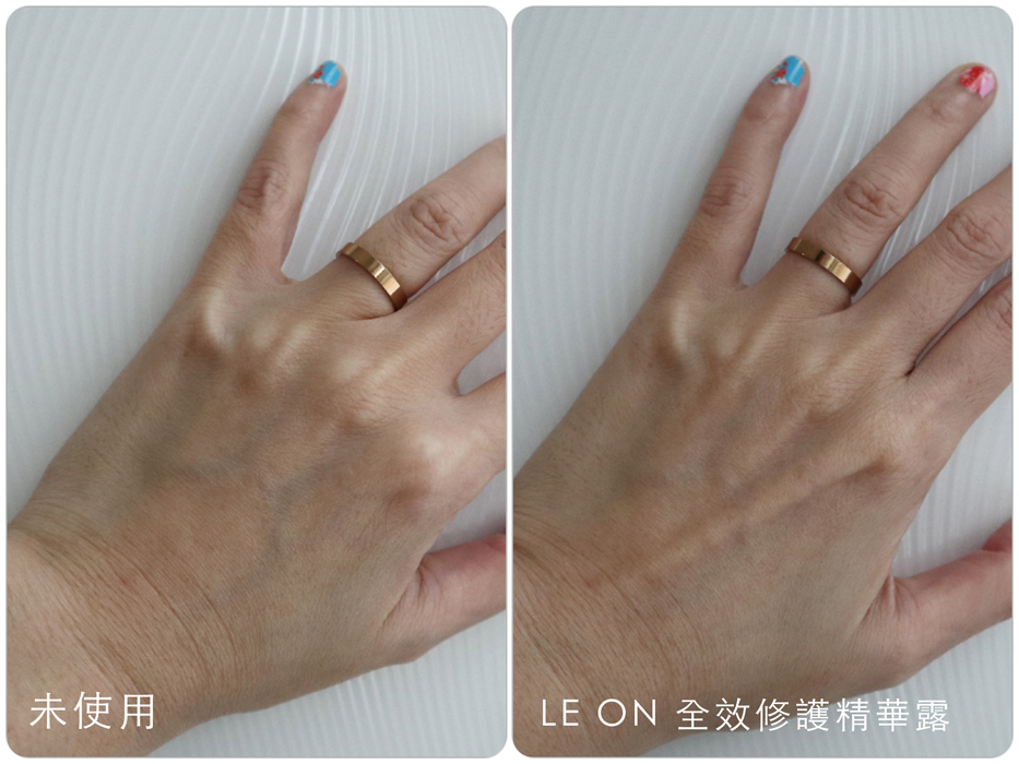 看看我平時沒有擦護手霜習慣的右手乾燥、鬆弛,偶而為了拍照塗抹保養品的左手是不是嫩白、平滑許多?