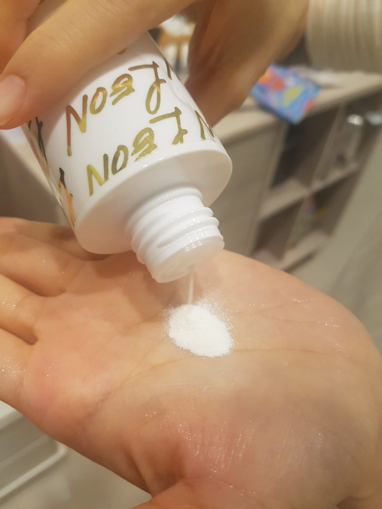 玻尿酸淨白保濕潔顏粉,瓶身輕巧,倒出的粉質相當細緻,觸感滑細,先將手以溫水溼潤,取適量潔顏粉(約0.5~1g,相當於一元硬幣大小)於掌中揉搓後,塗抹於臉部並輕柔按摩,可讓泡沫在臉上停留30秒後,沖洗乾淨即可。