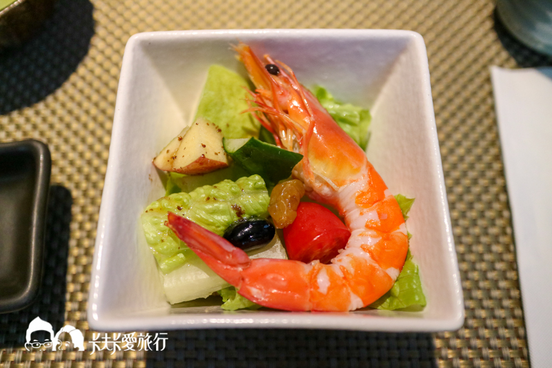 採用的是最大尺寸的頂級白蝦,生菜淋上主廚特調醬汁建議攪拌均匀食用