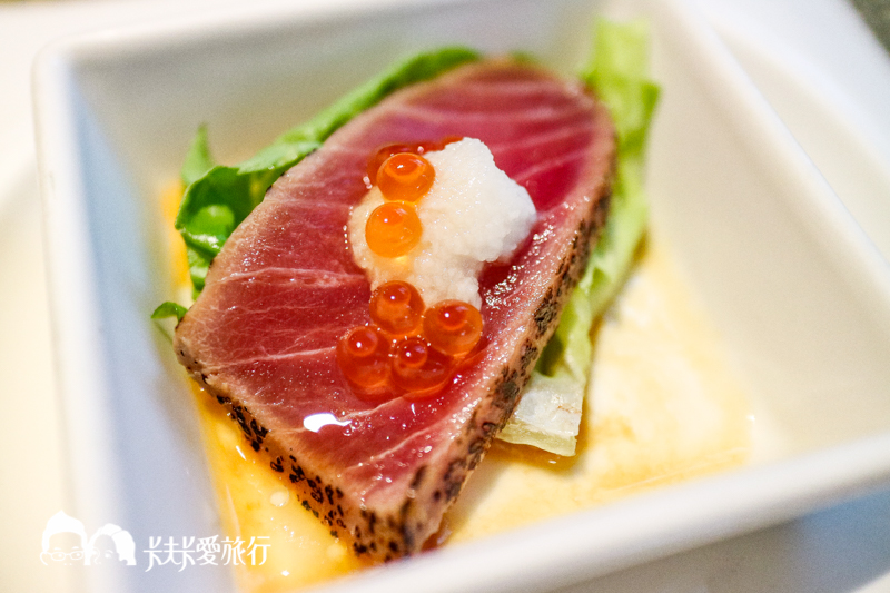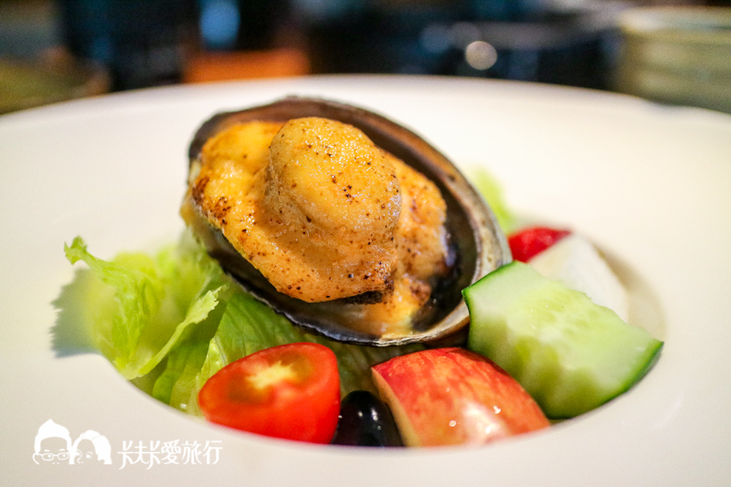 第一道和風蔬果鮑魚沙拉,採用新鮮炙燒鮑魚搭配以爽脆生菜及水果,可沾取主廚特調醬汁一起食用,外層是明太子醬炙燒味道鮮美
