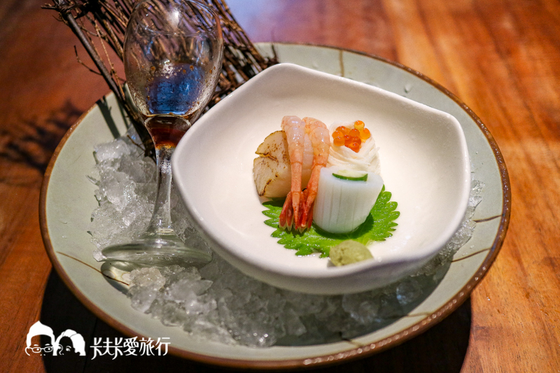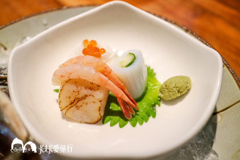 採用各種新鮮魚種,綠色大片葉子是日本進口的紫蘇葉,可撕成小碎片搭配食用有殺菌的效果,旁邊有新鮮現磨的山葵可以沾取少量再沾點特調的醬油即可,底下是山藥細麵,建議淋上和風醬汁攪拌使用