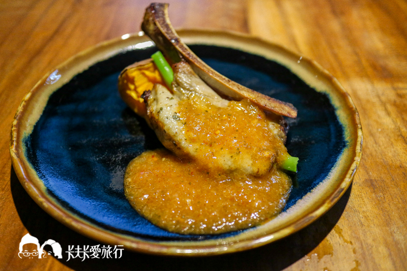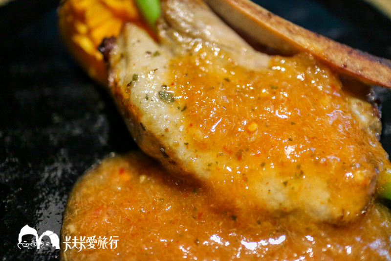 泰式酸辣醬,有明顯的香茅味道,戰斧豬排吃起來脆度十足,軟嫩的肉質與泰式醬很搭
